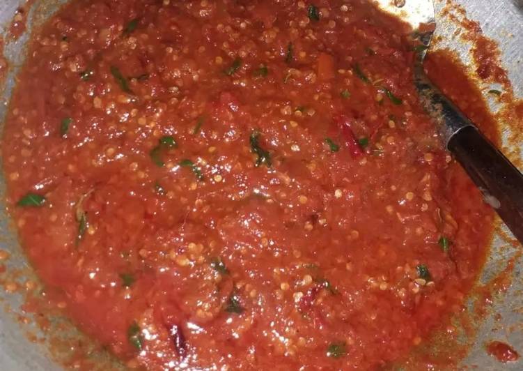 - Ganti wajan/minyak untuk menggoreng tomat hingga layu, tambahkan kemangi hingga layu, masukkan sambel yang sudah diulek tadi dan tumis sebentar, jika perlu tambahkan sedikit air agar.tidak kering/lengket dipenggorengan, koreksi rasa(garam&penyadapan/gula).